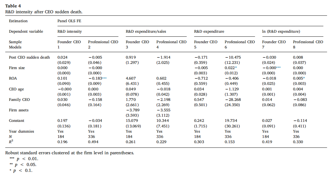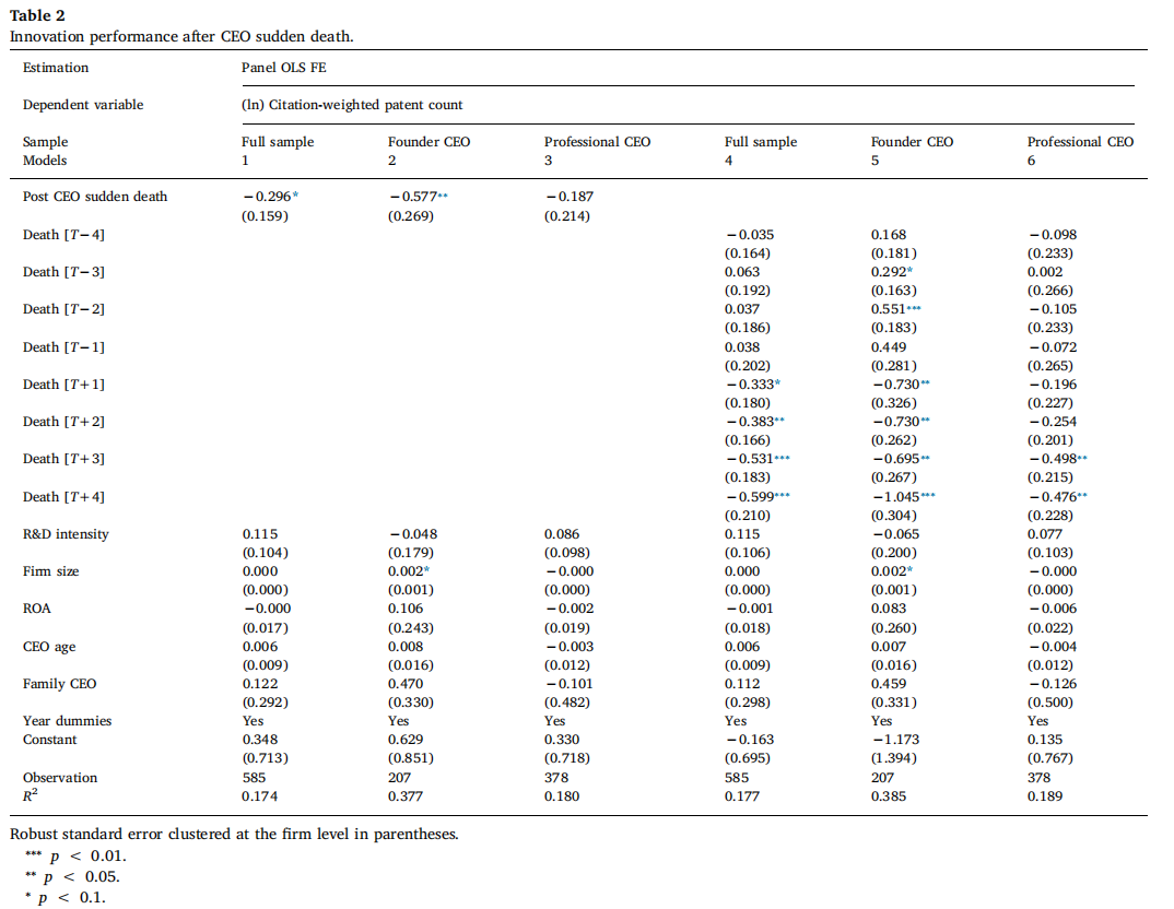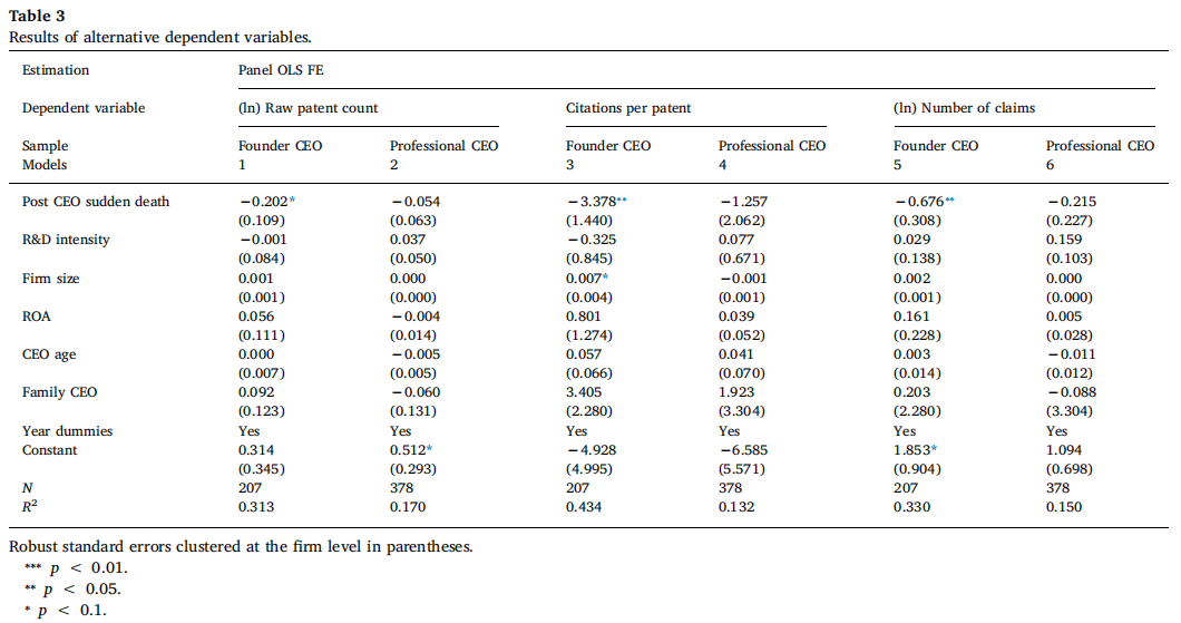 在表3中,为了识别创始人 CEO管理的公司和专业 CEO管理的公司创新绩效差异的来源,本文使用其他基于专利的因变量进行了相同的分析,包括原始专利数量、每项专利的引用次数和权利要求数。与公司固定效应面板OLS回归的结果表明,更换CEO对子样本的创始人CEO的突然死亡与原始呈现负相关专利数(模型1:β=−0.202,p < 0.1),每项专利引文(模型3:β=−3.378,p < 0.05),和索赔的数量(模型5:β=−0.676,p < 0.05)。然而,这种关系在职业CEO突然死亡的子样本中并不成立(模型2、4和6)。