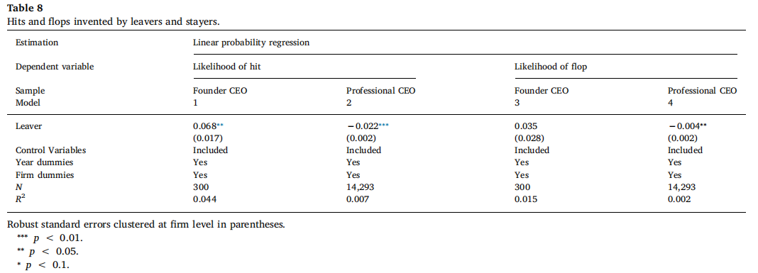结果表明,经验丰富的创始人CEO的突然死亡,离开者发明的专利比那些留任者发明的专利更有可能成为热门(模式1)。然而,在离开者和失败的可能性之间的关系(模式3),尽管离开者的系数是正的,这在统计上并不显著。另一方面,在经历了职业CEO突然去世的公司样本中,发现离职者发明的专利比留任者发明的专利更不可能成功或失败(分别为模型2和模型4)。这些结果表明,只有在创始人CEO突然去世的情况下,更具创新精神的员工发明家才更有可能离开。