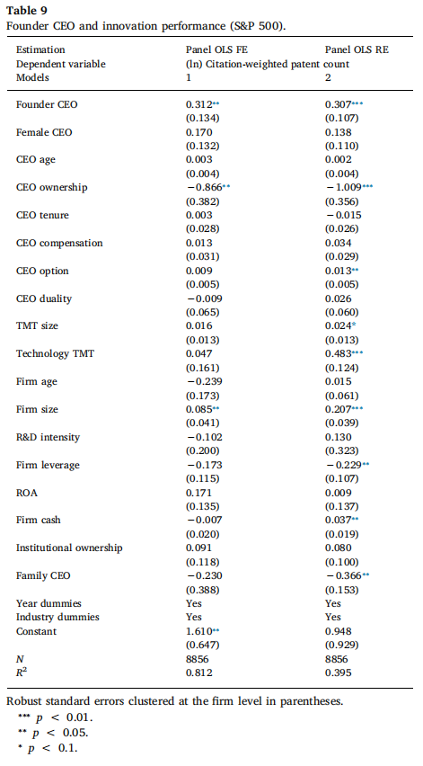 在大型上市公司的背景下,创始人CEO管理的公司比职业CEO管理的公司产生更多的创新成果和追求不同类型的创新(即有风险和探索性的创新)吗?如果是这样,这种差异来源于哪里?本文利用美国上市公司1979-2002年间经历CEO突然死亡的独特数据集,研究了创始人CEO与上市公司创新之间的关系。我们的主要结果表明,从创始人CEO到专业CEO的外生变化与公司的引用加权专利数量下降相关,即使在控制研发支出的情况下,这表明创始人CEO比专业CEO更善于管理创新。为了更好地理解这种关系,我们还探索了可能构成这种关系的机制。结果是,我们没有发现证据表明创始人CEO管理的公司比专业CEO管理的公司分配更多的资金用于研发投资。本文的发现对有关创新、创业精神和高层管理团队的相关文献具有很强的启示意义。在未来的研究中,考虑创始人CEO地位对技术创新以外的创新类型的影响,并将这些结果与目前的研究结果进行比较,将是有趣的。