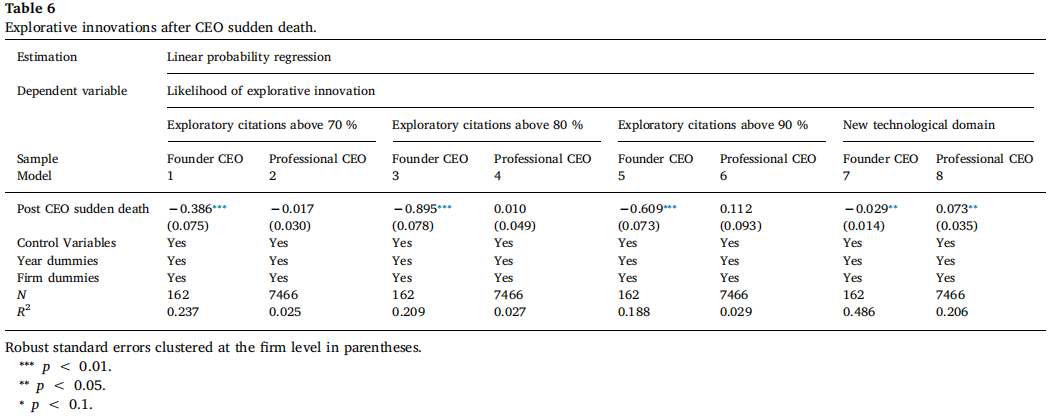 基于这些信息,利用线性概率模型检查了一个给定的专利成为探索性的专利的可能性。与预期一致,研究结果表明,在使用不同截止值来定义探索性创新的模型中,创始人CEO突然去世后,探索性专利的可能性更小(模型1:β =−0.386,p < 0.01;模型3:β =−0.895,p < 0.01;模型5:β =−0.609,p < 0.01)。然而,如此显著的影响在职业CEO突然死亡的子样本中不成立 (模型2,4,6)。同样,发现创始人CEO突然死亡之后发明的专利是不太可能发生在焦点公司没有什么经验的技术领域 (模型7:β=−0.029,p < 0.05);然而,有趣的是,专业CEO突然去世后发明的专利更有可能是在新的技术领域(模型8:β = 0.073, p < 0.05)。