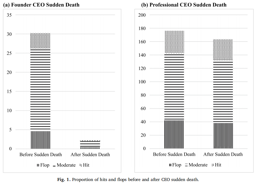 这一对比表明,虽然创始人CEO管理的公司在突然死亡事件后遭遇成功(95%)和失败(91.3%)的数量显著下降,但专业CEO管理的公司的数字要小得多:9.2%和8.4%,CEO突然去世后的成功和失败次数分别减少。