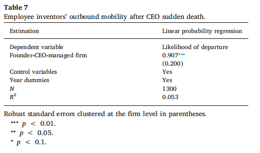 在表7中,检查了是否由于CEO突然死亡更换CEO而影响员工发明家的流动。因变量(离开的可能性),如果员工发明者是离职者被编码为1,如果员工发明者是留下来者则为0,自变量(创始人CEO管理的公司),如果某公司经历了创始人CEO的突然去世,被编码为1,如果某公司经历了职业CEO的突然去世则为0。