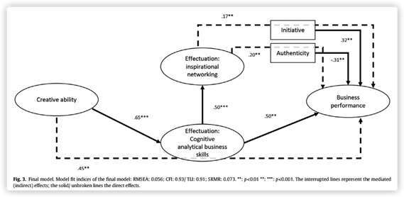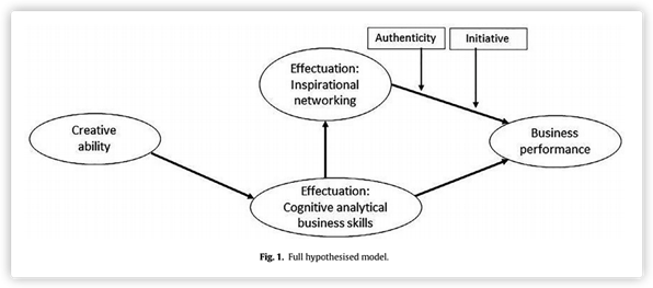 该模型假设创造能力首先为实施认知技能提供输入。而认知技能的有效应用被视为实现激励人心的社交网络技能的根本驱动因素。此外,模型中还嵌入了两个额外的变量。第一个为-Authenticity-,第二个为-Initiative-;两者都是创业特征,当一个创业绩效被研究时,它们是高度相关的。