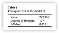 模型拟合的卡方检验如表1所示,表明88名参与者的样本允许足够的迭代来测试模型。0.012的P值表明了一个很强的显著性水平,这意味着模型的理论基础--及其潜在关系--并不是巧合。