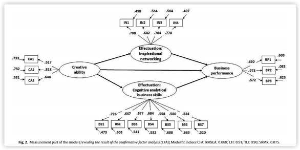 确认性因素分析 (CFA) 为设计具有四个内生(潜在)变量的模型提供了坚实的支持:a.创造能力 b.认知分析业务技能 c.鼓舞人心的社交网络技能 d.小型零售商的业务绩效或成功标准。模型拟合指标表明结果是令人满意的:RMSEA: 0.068(<0.08);CFI: 0.91 (> 0.9) / TLI: 0.90( > = 0.9);SRMR: 0.075( < 0.08)。因此,确认性因素分析(CFA)的模型拟合指数支持所有外生变量被证明是四个内生变量的有效、可靠测量。模型的测量部分如图2所示。