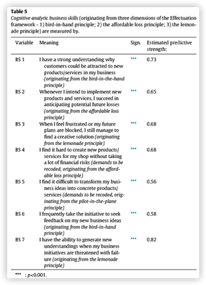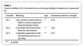 小型零售商的业绩确实受到认知分析业务技能的积极和直接影响,影响相对较强(估计配对预测强度:0.5,p < 0.01);外生变量:主动性(变量IN1,衡量在网络中频繁采取主动性)和内生变量成功标准之间确实存在强而直接的正相关关系;外生变量IN 4与成功标准之间存在负直接关系,承认社交网络是激励和绩效的重要来源。这意味着通过自主思考和推理获得的社会独立性对于激励性网络能力的积极影响非常重要;创新能力与认知分析业务技能有直接关系,预测强度为0.65***;认知分析业务技能直接影响灵感网络的能力(估计预测强度:0.5;p < 0.001)。
