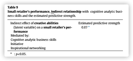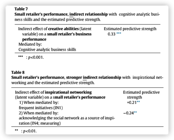 模型提供了相对有力的支持:1)创新能力;2)认知和分析的业务技能;3)鼓舞人心的社交网络能力,确实积极影响一个小型零售商的经营业绩。该模型中最显著的路径之一是创新能力对小型零售商业绩的间接影响,由认知分析业务技能介导,这条路径指出了将创业创新能力和认知分析商业技能结合起来的必要性。此外,在创造能力和认知分析能力之间存在着强烈而直接的关系。创新能力可以被视为有效执行认知业务技能的输入,后者再次对小型零售商的业绩有强大和直接的影响。换句话说,创新促进商业技能的执行,而认知商业技能的有效激活对小型零售商的绩效有直接的正向影响。另外,成果的社交网络技能与成功标准之间的关系是复杂的。尽管将社交网络作为创新的灵感来源是鼓舞人心的社交网络能力的关键衡量标准,但它对小零售商的业绩的直接影响是负面的。