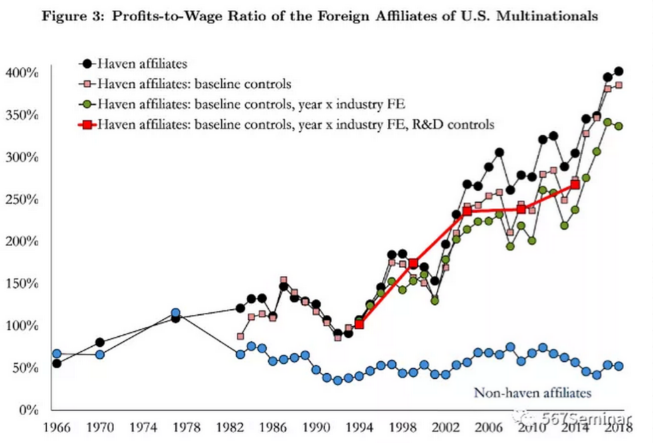 当按母公司所在国对转移利润进行分配时,本文发现,美国的跨国企业将其利润的54%转移至避税天堂,而其他国家及地区的跨国企业转移比例为27%。