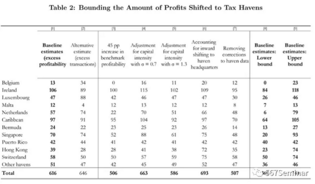 表2给出了每个避税天堂具体的利润转移数量,列1和列2分别为基于超额盈利能力和超额跨境交易测算方法的结果。两种方法测算出的利润转移数量基本保持一致,可以看到,在我们熟知的如爱尔兰、加勒比海、新加坡和卢森堡等避税天堂中,跨国企业转移了大量的利润。