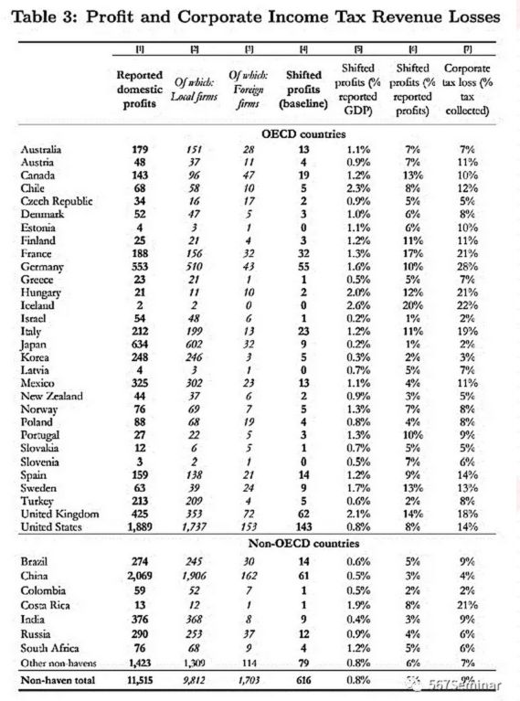 按来源国将在避税天堂的利润重新进行分配,本文计算出了不同国家和地区的利润损失和税收收入损失程度。表3报告了各国及地区报告的国内利润,利润损失采用三种方法计算,分别是转移利润的实际数量(列4)、占国内GDP的比重(列5)及占报告利润的比重(列6)。