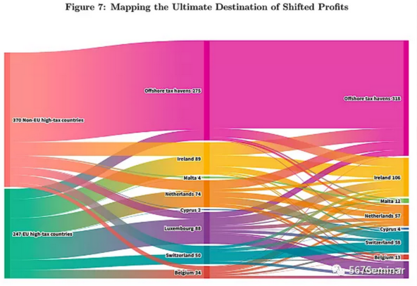 此外,从利润转移的过程来看,跨国企业的利润在避税天堂内经历了多次流动,图7展示利润在不同国家间转移的全过程。以欧盟为例,高税国的流出的利润中有77%首先进入欧盟的避税天堂,而后其中的46%最终到达非欧盟的避税天堂。