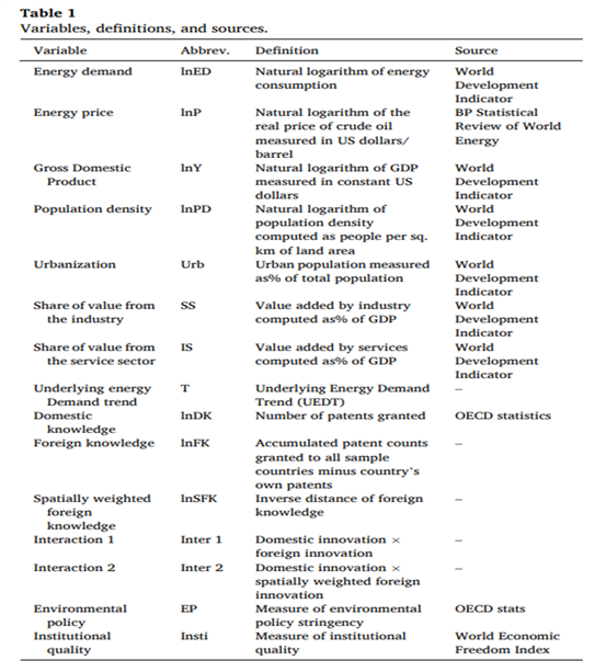 本文检验了24个创新国家在1994年至2013年间的能源效率绩效,研究国内和国外的创新如何国家的能源效率。(1)技术创新是根据专利数量来衡量的,有关专利的数据摘自经合组织统计 (OECD -ilibrary.org)的三方同族专利数据(Triadic patent families)。使用三方同族专利作为数据集有两个主要优势。首先,它排除了低价值发明。其次,它降低了本土优势和地理位置对专利统计的影响。(2)利用经合组织环境政策严格性指数进一步研究了环境和能源政策对能源效率的影响。该指数的范围在0-6之间。(3)使用世界经济自由指数(EFW)的数据用作为衡量制度质量的指标,以评估制度质量对能源效率的影响。(4)将原油价格(以美元衡量)与该国的消费者价格指数相挂钩来构建每个国家的能源价格数据。其中,有关消费者价格指数的数据是从Penn World Tables (PWT) 9.0(佩恩表)版中提取的。