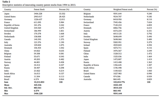 鉴于知识存量集中在美国和日本这两个国家,专利存量的分布高度倾斜,可能影响了结果。因此,本文将这两个国家从分析中予以剔除。