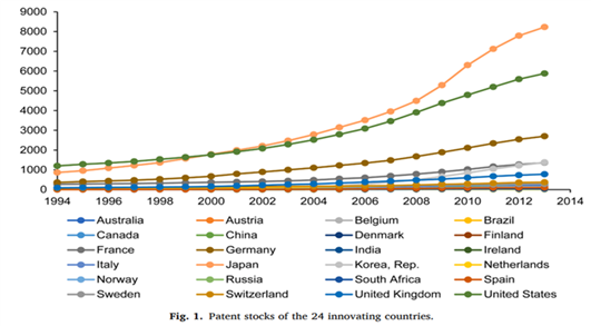 从图1可以看出,只有美日韩英等少数发达国家的专利存量呈现出明显的正增长趋势,而其他国家的专利存量则呈现出增长、下降和停滞的混合趋势。