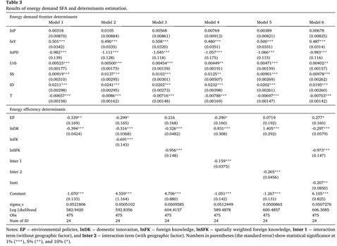 相较于其他研究,本文从全球视角考察了国内外创新及其相互作用对能源效率的影响,拓展了能效与创新之间的关系。并且,本文通过采用不同的能效指标来解决以往研究中的方法问题。采用随机前沿分析(SFA)在能源效率文献中,利用能源需求函数控制随机噪声和未观测到的异质性,有助于减少效率估计的偏差。在考虑国家具体特征的情况下,本文还考察了地理位置在知识扩散和能源效率绩效中的作用。如果国家之间距离很近,拥有相似的产业,或者具有相同的吸收能力,那么知识溢出的可能性就会更大。同时,本研究还纳入了环境政策工具在提高能源效率方面的作用。严格的能源或环境政策工具可以促进国内创新,从而提高能源效率,并抑制搭便车行为。