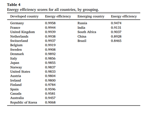 如表4所示,每个国家的能源效率得分都比较高,表明平均而言,创新国家在短期内在追赶基准技术方面取得了重大进展。