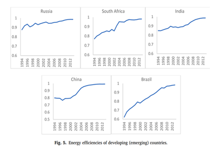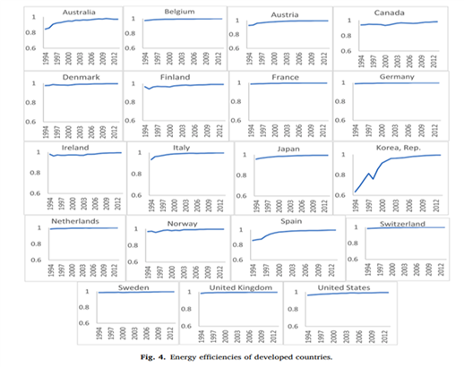 根据图4所示,可以得出结论,由于强大的经济基础和技术创新的扩大,发达国家的能源效率在选定的时期内不断提高。