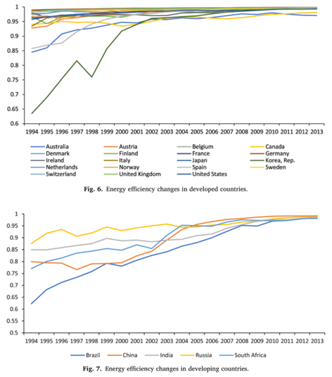 图6和图7显示了发达国家和发展中国家在样本期内的能源效率变化。总的来说,所有发达国家都集中在顶端。发展中国家的能效途径也在稳步增加,能效趋同也更加明显。