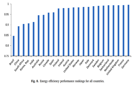 图8为各国能源效率排名。德国、法国、英国、荷兰和瑞士是能源效率最高的国家,而巴西、中国、南非、韩国和印度是能源效率最低的国家。