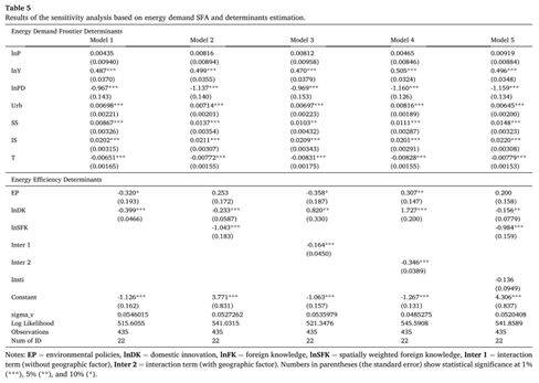 由于式(4)中的变量为无效率因素,其负值表示能源无效率降低。如果国内创新(KDomesticct)提高了能源效率,那么能源无效率项应该为负数,这将意味着国内创新减少了与前沿的距离--这意味着能源低效率的降低。反之,如果系数为正,则表明国内创新增加了与前沿的距离,这意味着能源低效率的增加。