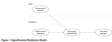创业型领导定义为一种通过识别和利用创业机会(Renko et al. 2015)影响并指导下属实现组织目标,以有效促进下属参与工作场所创新行为的领导风格。心理赋权理论(Spreitzer 1995)认为领导在塑造下属的主观感知方面发挥着重要作用,通过作为下属榜样,并为下属的提供支持,创业型领导对下属的创新行为有着积极影响。公共服务动机(PSM)定义为-由来自公共机构和特定价值使命激发的一种特殊形式的利他主义或亲社会动机-(Perry,Hondeghem,and Wise 2010,682)。尽管越来越多的研究证实了PSM对下属绩效和其工作结果的积极影响,但很少有研究考察了PSM对下属创新行为的影响以及产生这些影响的可能机制(Ritz,Brewer,& Neumann 2016)。