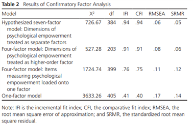 我们首先进行了验证性因素分析,以检验本研究中使用的变量的结构效度,并确定心理赋权的四个维度(意义、能力、自主权、影响)应该被视为独立的因子,还是应该合并成为一个高阶因子。检验发现七因素模型(创业型领导、PSM、意义、能力、自主权、影响和创新行为)比其他模型对数据的拟合更好(见表2)。