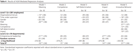 总的来说,创新行为中31%的差异可以用我们的模型来解释,这代表了传统标准下的大效应量(Cohen 1992)。在控制中介变量时,创业领导对创新行为的直接影响不具有统计学意义,支持完全中介的推论。同样,PSM对创新行为的直接影响也不具有统计学意义,支持完全中介的推论。