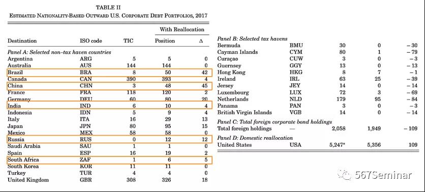 综上,本文发现企业的证券投资规模远大于官方数据,由于大型跨国企业通过避税天堂进行境外融资,大型新兴经济体的投资头寸实际上被低估。进一步比较企业债券头寸和国债头寸的重新配置情况,结果显示,相比于跨国企业,主权国家多以国家名义对外发行国债,因此在考虑一国的外部负债时,企业债券往往比国债产生的影响更大(见附录表7,此处未展示)。
