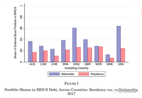 再分配结果显示,从债权投资来看,发达国家向包括金砖国家在内的大型新兴经济体的债权投资比例大幅上升。相比于企业通过避税天堂子公司发行证券的做法,主权国家多以国家名义对外发行国债。因此,传统的经济数据夸大了国债相对于公司债券的重要性。并且,大型新型经济体的外部负债中,多以美元和欧元进行计价。从股权投资来看,发达经济体对中国的股票投资在修正后显著增加,背后的原因在于中国企业多使用VIE(Variable Interest Entities,可变利益实体)架构,通过避税天堂设立壳公司进行证券发行以实现海外上市的目的。VIE架构下的企业投资价值不能准确度量,从而使得中国的官方统计高估了NFA(Net Foreign Assets,海外净资产)头寸。