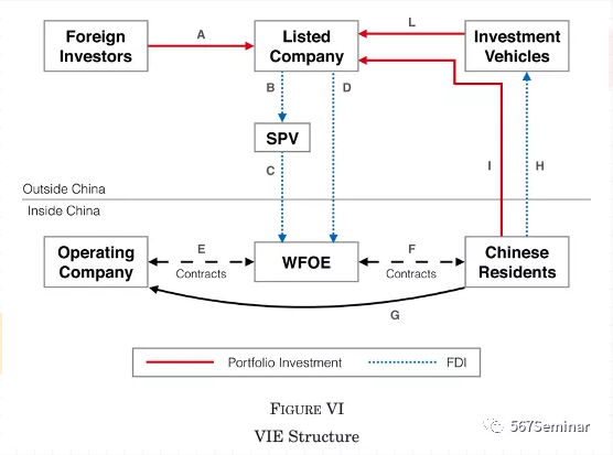 如图6所示,VIE架构的搭建流程如下。首先,内资公司的创始股东在BVI(英属维尔京群岛)或CI(开曼群岛)设立境外公司,该公司与私募、风投及公众股东,再共同成立一个公司(通常在开曼群岛)进行融资上市。之后,上市公司主体在香港设立100%持股的SPV(Special Purpose Vehicle,特殊目的实体)。SPV再设立一个或多个外商投资企业(WFOE),SPV可以返程投资WOFE,并通过WOFE与境内VIE公司签署一系列控制协议(VIE协议),并将境内VIE公司的收益转移到SPV,最终在完税后将经营利润转移至境外母公司。在中国,如BAT、新浪、京东等诸多企业均采用VIE架构进行境外上市。
