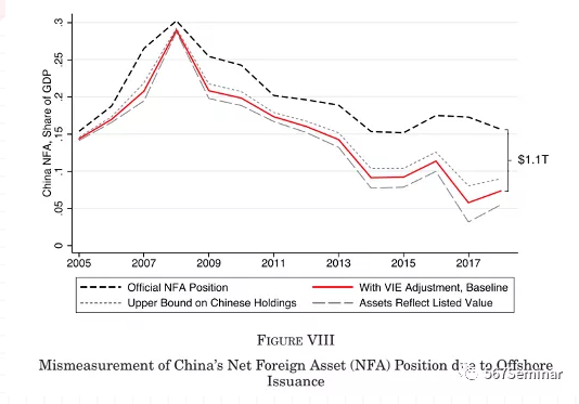 企业普遍使用VIE架构在很大程度上扭曲了中国的宏观经济数据,主要体现在NFA的估计。与境外投资者直接持有中国股份的情况不同,VIE架构下的境外股权投资应当被视作是中国的FDI,由于中国法律不承认境外上市外资股是境内经营实体的权益,在官方统计中拒绝将持有WFOE的股权视作上市公司的市值,使得VIE架构下的FDI没有计入中国的外部负债。图8展示了修正中国NFA头寸的结果,官方统计实际上存在严重的高估,2018年中国实际的NFA头寸比官方数据低1.1万亿美元。