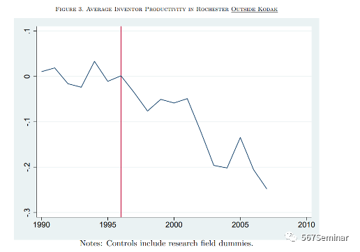 本文中,作者以柯达公司为例,实证检验了在数码摄影技术推广这一外生冲击下,柯达公司的衰落导致罗彻斯特高科技集群规模缩小是否对非柯达发明者的生产率产生影响。图3显示了1990-2007年间罗切斯特非柯达发明家平均生产率的变化,在1996年数码摄影技术推广之前,对数平均生产率保持持平,但1996年之后,对数平均生产率开始下降。此外,作者还进行了双重差分估计,比较了1996-2007年间罗彻斯特非柯达发明者与其他城市非柯达发明者生产率的变化,结果表明,1996-2007年间,罗切斯特的非柯达发明者的生产率相对于其他城市的发明者下降了20.6%。