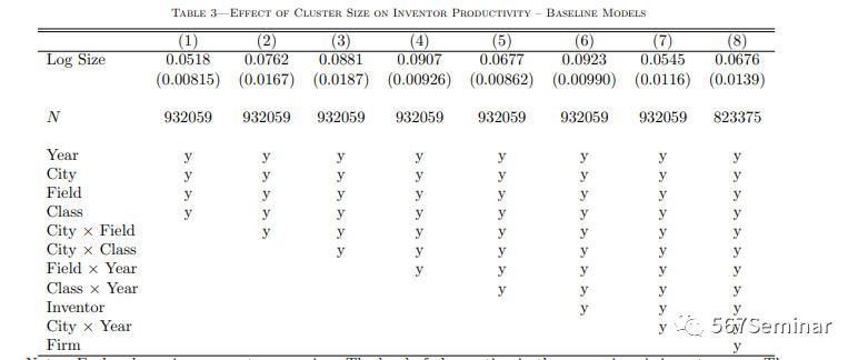 其中,y为发明者生产率、S为集群规模、i为发明者、j为公司、f为研究领域、k为技术类别、c为城市、t为年份、d为固定效应。基准回归结果如表3所示。