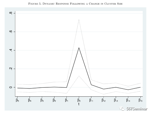 图5的结果表明未来集群规模的变化对当前生产率的影响,排除了明星发明家从小规模集群迁移到大规模集群对结果的影响,这种对发明者生产率的影响在集群规模变化当年就已有显现。而且,与图5相比,图6非当年生产率下降更多,这表明由发明家迁移带来的影响至少能够持续5年。