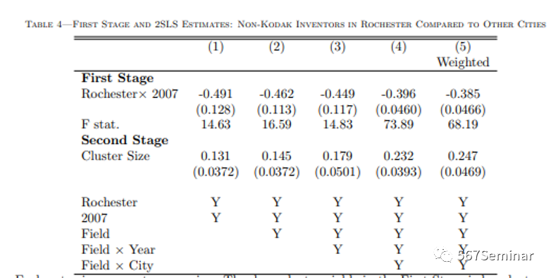 第一阶段回归结果中,第1列的-0.491(.128)至第4列的-0.396(.0460)表示未加权估计范围,在研究领域和年份、研究领域和城市两个组合中,罗彻斯特的集群规模相对于其他城市下降了39.6%。第二阶段回归结果中,第1列的0.131(0.037)至第4列的0.232(.0393)表示发明者生产率相对于集群规模变化的弹性。