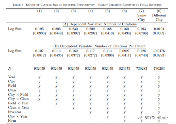 为了阐明科学家在规模较大的集群中生产率会提高的作用机制,作者转向对明星发明家的引用进行分析。结果如表7所示。