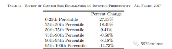 其中,由于集群A规模缩小了,gongshi ;集群B规模变大了,gongshi 。由上述公式可知,总效应取决于初始集群规模加权的每个集群中发明者生产率的变化。