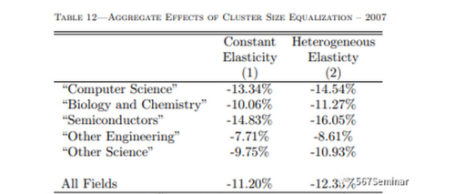 利用上述扩展模型,作者估计了每个研究领域中集群规模均等对美国在该领域产生专利总数的总效应。结果如表12所示。