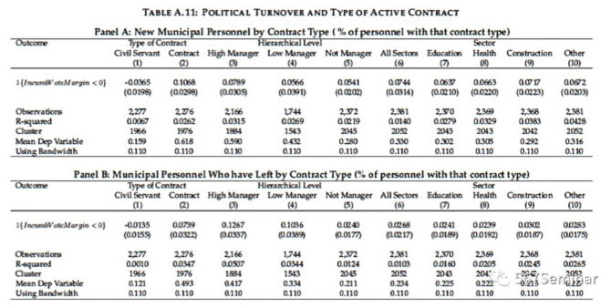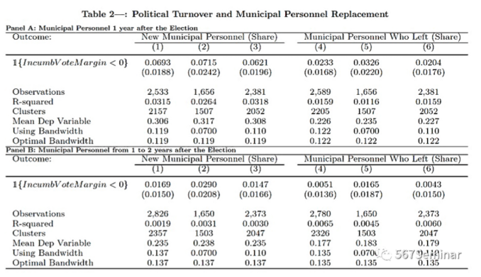 本文发现,相比于没有政党更迭的地级市,发生政党更迭的地级市公务员队伍出现巨大的人事变动,表现为新进公务员的数量表现出了显著的增长(Fig 3)。在选举结束后的一年内,劳动合同的签订约增加了7%(Table 2 Panel A,Col 1-3),而终止的劳动合同并无明显变化(Table 2 Panel A,Col 4-6)。