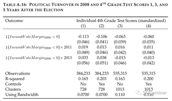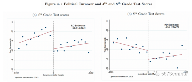 以4年级和8年级学生PB考试的成绩作为衡量公共教育质量的指标。Fig 4的结果表明,在发生政党更迭的地级市,两个年级的学生成绩均有不同程度的下降,分别下降了0.08个标准差和0.05个标准差。变化不同的控制变量和调整带宽,结果也均保持稳健(Table 3,未展示)。而从长期来看,政党更迭对学生成绩的影响并不明显,主要在选举后1年具有显著的负向影响(Table A16)。