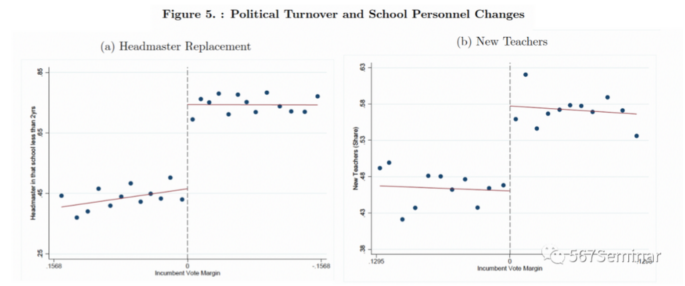 从学校的人事变动来看,所在地级市发生政党更迭的学校,校长和老师的变动率均有提高(Fig 5)。相应的回归结果显示,校长的变动率平均增加了28%(Table 4,未展示),老师的变动率平均增加了11%,但新进教师和离职教师的数量基本持平(Table 5,未展示)。