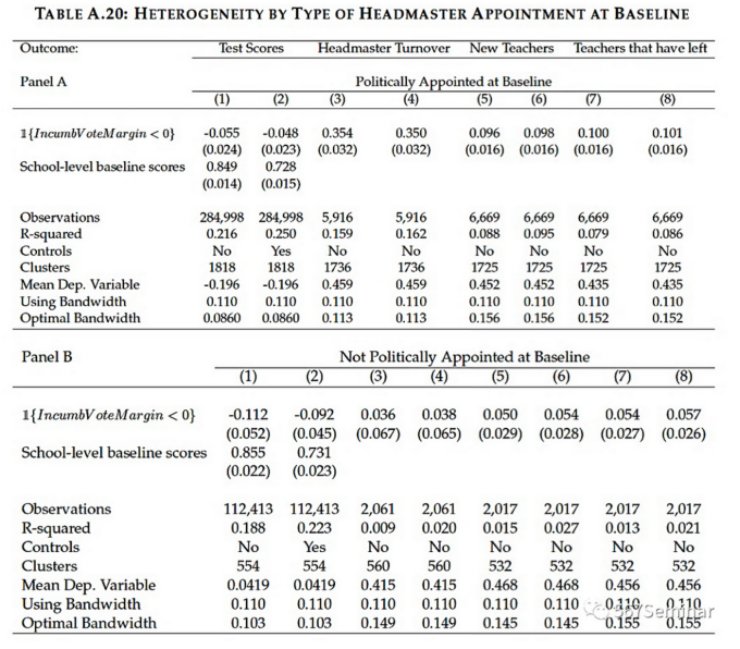由于大部分校长都是以政治任命的方式选拔上来,政党发生更迭时,出于政治利益的考量,政治任命的学校更有可能发生人事的变动。分析结果显示,相比于非政治任命的学校,政治任命的学校其校长和老师的变动率都更高(Table A20)。