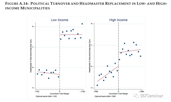 现实中,家长可以抗议反对通过政治任命选拔校长,但在一些收入比较低的地区(以收入中位数为标准),家长对公共教育资金的关心程度不高,因此给予了当地政府在教育人事上更多的裁量权。Fig A14表明,低收入地区相比于高收入地区校长的变动率更高。