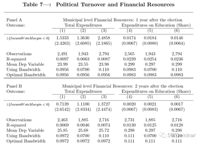 为准确估计出政党更迭与公共教育质量的因果效应,本文使用断点回归的方法,利用选举时两党选票之差的断点判断政党是否更迭,模型设定如下: