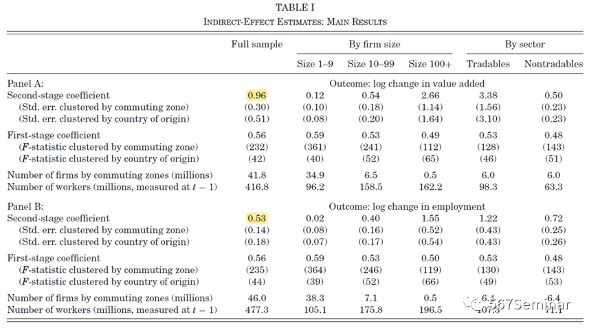 表2报告了工具变量两阶段最小二乘结果第一阶段回归F值远大于10,说明根据来源国刻画企业地理集聚的信息能够很好地度量cz通勤区内外国企业雇员占比变化情况。第二阶段估计结果显示外资跨国企业雇员的增加能够使得国内企业附加产值、就业、企业支付薪酬和工人工资分别增加0.96%、0.53%、0.63%和0.15%。这一效应在规模更大和处于贸易部门的企业表现的更明显。