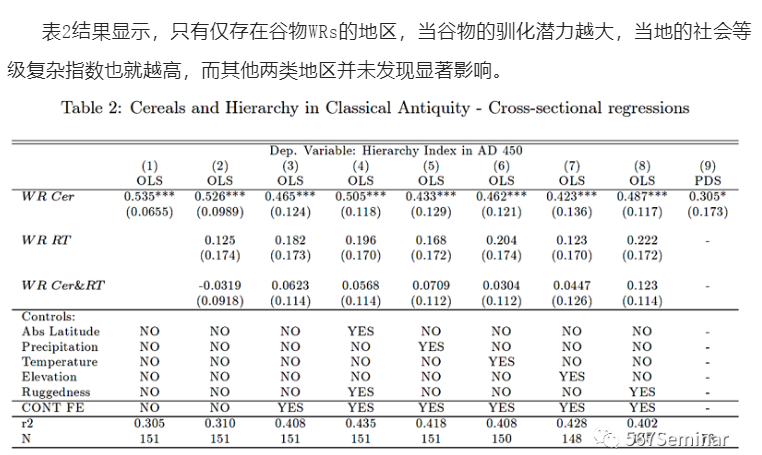 接下来,本文糅合了考古学、人类学和农学等多套数据,采取不同的研究策略对谷物与国家形成之间的关系进行了验证。首先,本文考察了前工业化时期种植谷物是否能够促进社会层级的多元化,使用谷物与根(块)茎作物的潜在热值差作为工具变量。结果显示,谷物种植与地区社会层级复杂程度之间表现出了显著的正相关关系。接下来,本文将视角着眼于更早的古典时期,利用各类作物的野生近缘种(wild relatives:WRs)的地理分布情况作为农作物驯化潜力的代理变量,并使用新的社会等级复杂指数进行回归。除此之外,本文还使用“哥伦布大交换”这一外生冲击,研究了作物种类的改变如何影响当地社会结构,发现上述结论依旧成立。最后,以城市和部落遗址代表文明的兴起,本文也发现谷物的种植推动了早期的城市化进程。
