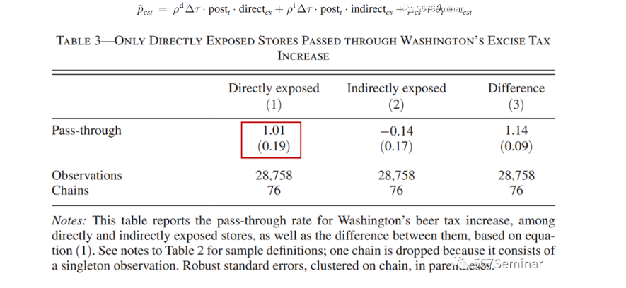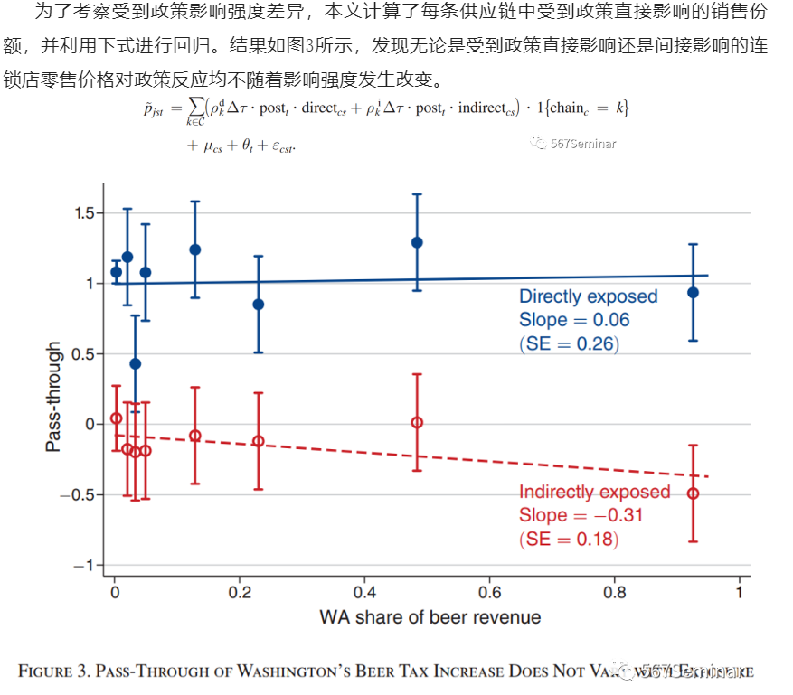 本文进一步利用如下式子估计价格转嫁程度,其中c、s、t分别代表供应链、州和星期,被解释变量是实际价格剔除连锁店给定商品价格均值后的残差。回归结果报告在表3,其中受到政策直接影响的连锁店零售价格转嫁程度为1.01,受到政策间接影响的连锁店零售价格没有发生显著变化。