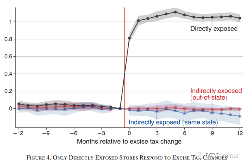 华盛顿州在2010年6月1日将每加仑的啤酒消费税提高了0.5美元,约为啤酒价格的5%,增税的目的一定程度上是为了弥补经济大衰退导致的预算缺口。在华盛顿州提高啤酒消费税的前9个月和后12个月之间,其他州均未对啤酒消费税进行调整,故可以将位于华盛顿州的连锁店定义为处理组,其他地区的连锁店定义为控制组。图2刻画了直接受影响的连锁店、间接受影响的连锁店以及未受到影响的连锁店零售价格变化,发现受到政策直接影响的连锁店零售价格显著上涨,其他三种类型的连锁店零售价格未发生明显变化,意味着不存在溢出效应。