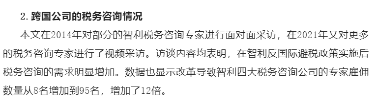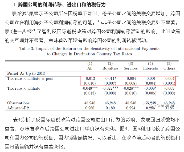 研究发现:①子公司所在国税率每降低1个百分点,母、子公司之间的交易增加5.5%。相比之下,母公司与非子公司之间的交易对海外税率变化不敏感;②反国际避税改革不会对跨国公司内部交易总额、特许权使用费以及利息等产生影响,跨国公司的进出口价格在改革前后也不存在显著差异;③跨国公司的纳税金额和国内销售额没有受到改革的影响;④访谈表明跨国公司的税收咨询服务需求大幅增加,意味着税收筹划是反国际避税政策失效的重要原因。