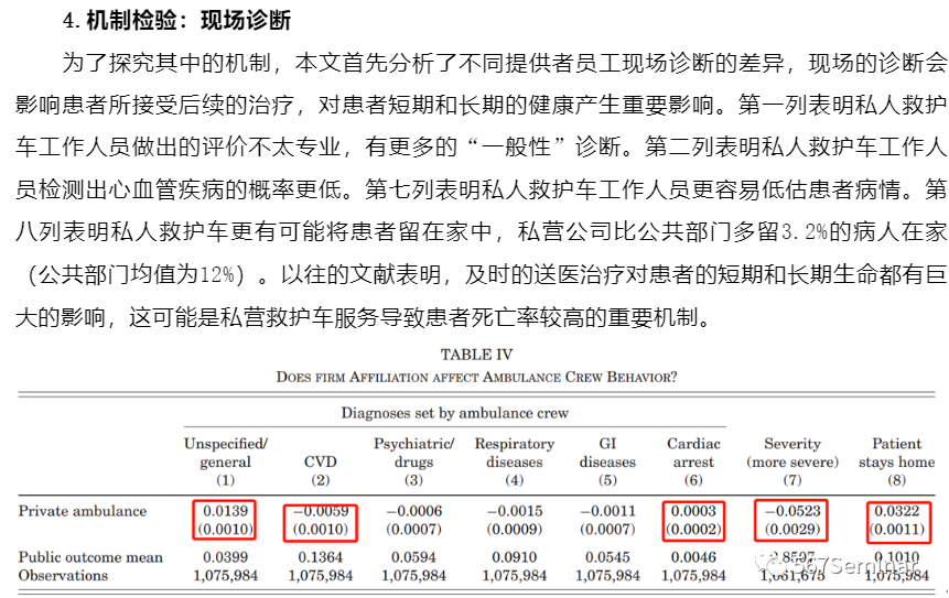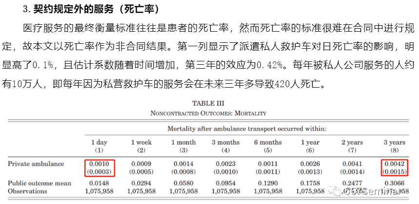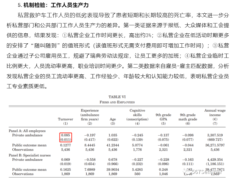 基于此,本文创建了块级大小的地理固定效应进行控制,以确保每个网格中患者获得治疗概率基本恒定,进一步估计救护车提供类型的因果效应。实证结果如下:①对于契约规定的服务(响应时间),私营企业对于救护车调配的响应速度快8%,到达病人的速度快7%;②对于契约规定外的服务(死亡率表示),私营救护车公司创造了更高的死亡率,由私营企业提供的救护车服务会导致患者的死亡率增加0.42%,该效应一直持续到第三年。成本收益分析发现,私人救护车导致死亡的成本约占斯德哥尔摩县救护车市场总成本的25%,大大超过了外包节省的成本。机制分析发现,私人救护车对病人的诊断不足,把更多的病人留在家里。进一步分析发现,私营企业的救护车工作人员专业水平不足是导致死亡率过高的原因:①私营公司通过绕开劳动政策使员工工作时间变长,在职培训减少,大量使用加班和临时员工;②私营企业雇员更换工作场所的频率更高,认知的能力更低。当考虑到加班时长时,私营企业雇员的时薪更低。